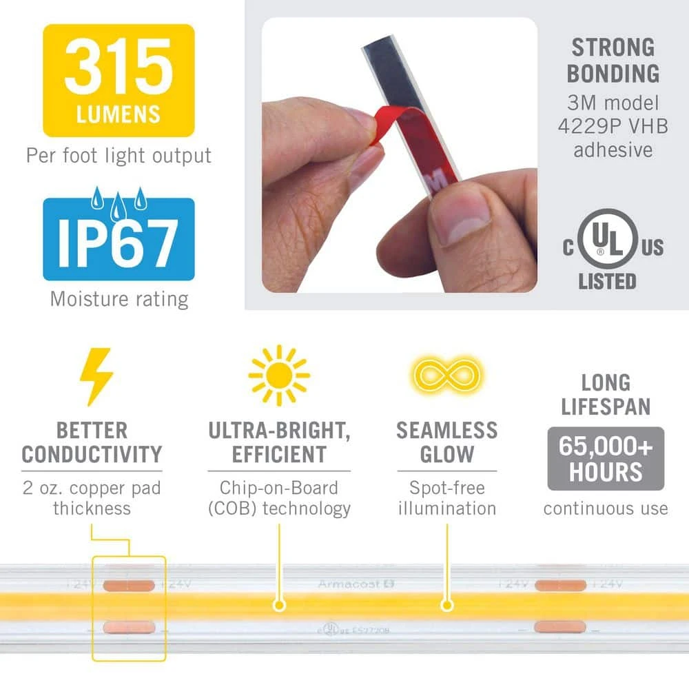 Discover seamless waterproof LED tape lighting with 24-Volt COB Outdoor LED Strip Lights from Armacost Lighting. The continuous LED light strips utilize Chip-on-Board (COB) technology, to produce smooth, bright, and spot-free illumination. With IP67 weatherproof protection, flexible LED strip lights are suitable for both indoor and outdoor environments. Designed to meet the needs of lighting professionals, it features top-quality components for superior longevity and a premium appearance. It’s ideal for outdoor LED accent lighting on decks, porches, docks, and patios. Pair it with an Armacost Lighting 24-Volt power supply (required) and optional dimmer or switch (sold separately) for the ultimate lighting experience.