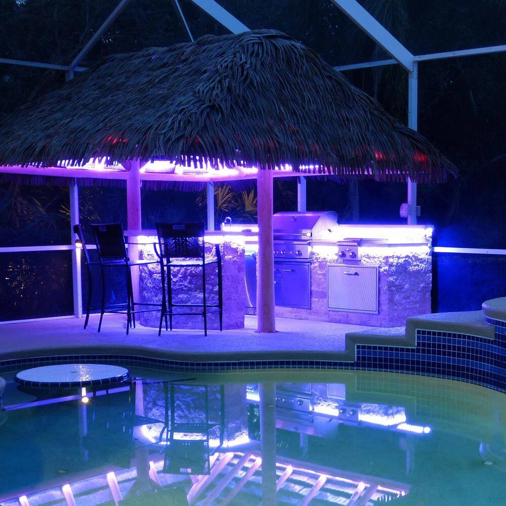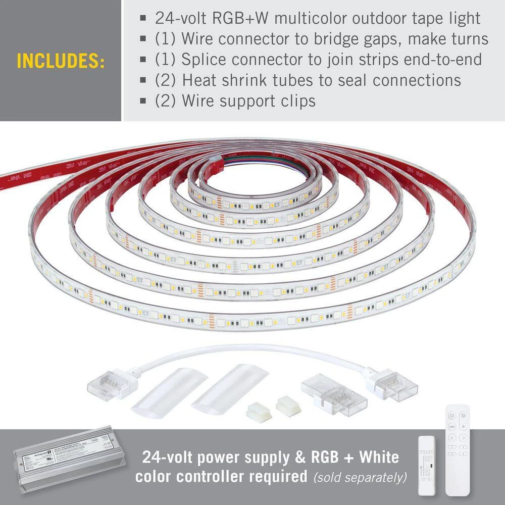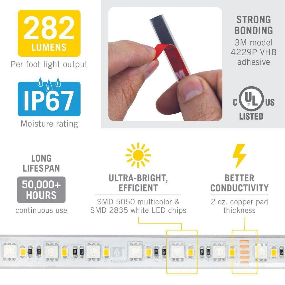 Armacost Lighting’s Multicolor + White (RGB+W) RibbonFlex Pro 24-Volt Outdoor LED Strip Light Tape features advanced IP67 waterproof technology that is ideal for any outdoor LED accent lighting project, such as decks, porches, landscapes, vehicles, docks, and more. Multicolor + White LED strip light tape combines RGB (red, green, blue) color with white to product multiple color options and a pure soft white (3000K) light. IP67 rated tape light is 100% protected from dust and sand and protected against immersion in water between 5.9 – 39.37 in. (15cm – 1m) deep for up to 30 minutes. The 24-Volt silicone coated LED tape light is great for longer length installations while still being energy efficient.