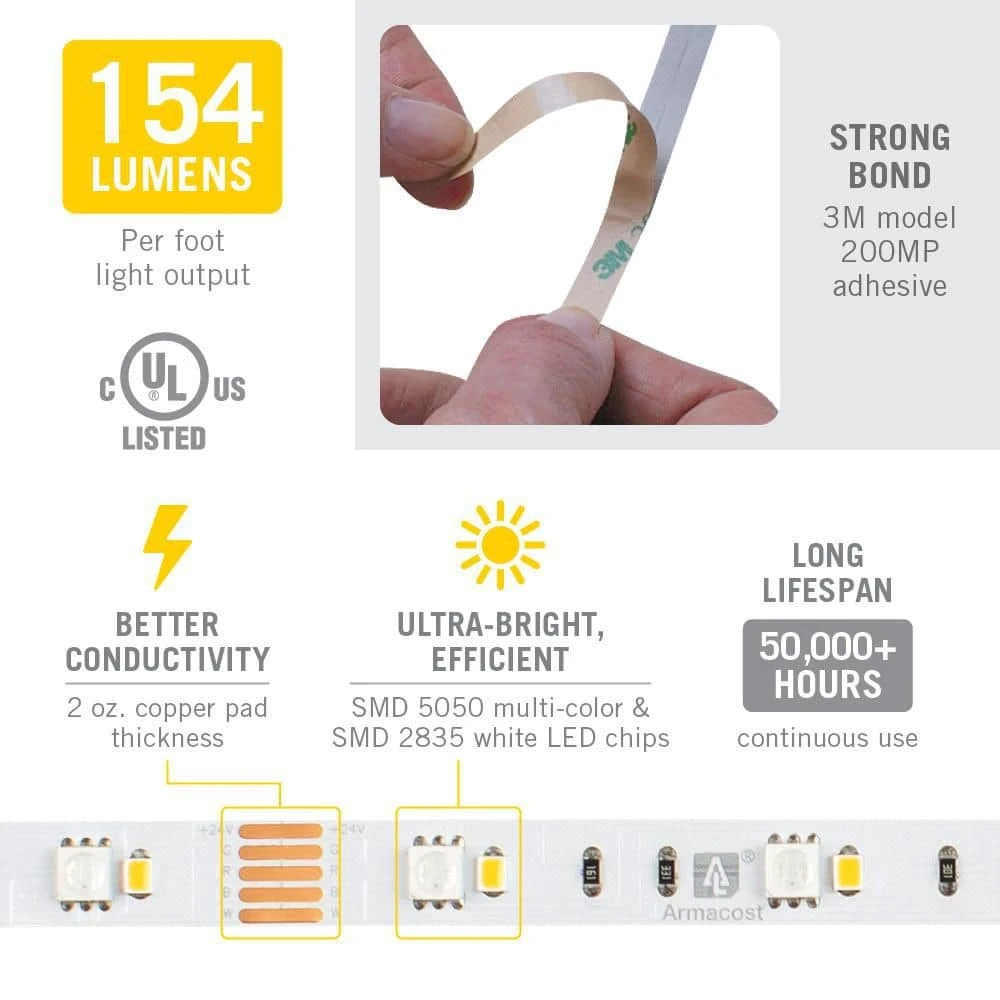Armacost Lighting’s RibbonFlex Pro Multi-Color plus White LED Tape Light is the perfect LED light strip for low-voltage, energy-efficient accent lighting project. The LED lights combine RGB color with White to create a truly customizable lighting solution. The 30 plus 30 Multi Color plus White strip lights include 30 RGB and 30 White LED diodes, that deliver multiple color options and soft-bright (3000K) white light. These LED strip lights are designed to meet the layout and installation requirements of lighting professionals and feature high quality, professional-grade components that are longer lasting and create a premium look. The 24-Volt strip lights are easy-to-install and feature 3M adhesive backing for a permanent hold. LED light tape is ideal for many applications including under cabinet lighting, tray ceiling lighting, toe kicks, RVs, boats, motor homes and commercial spaces. RibbonFlex Pro LED Tape Light is part of Armacost Lighting’s premium-quality component-based system, designed for custom installations. Includes: Multi-color RGB+W LED tape light, 1 SureLock Wire Lead Connector to bridge gaps and make turns, 2 peel-and-stick wire support clips, 2 low-voltage power wire leads (one on each end), detailed Planning & Installation Guide