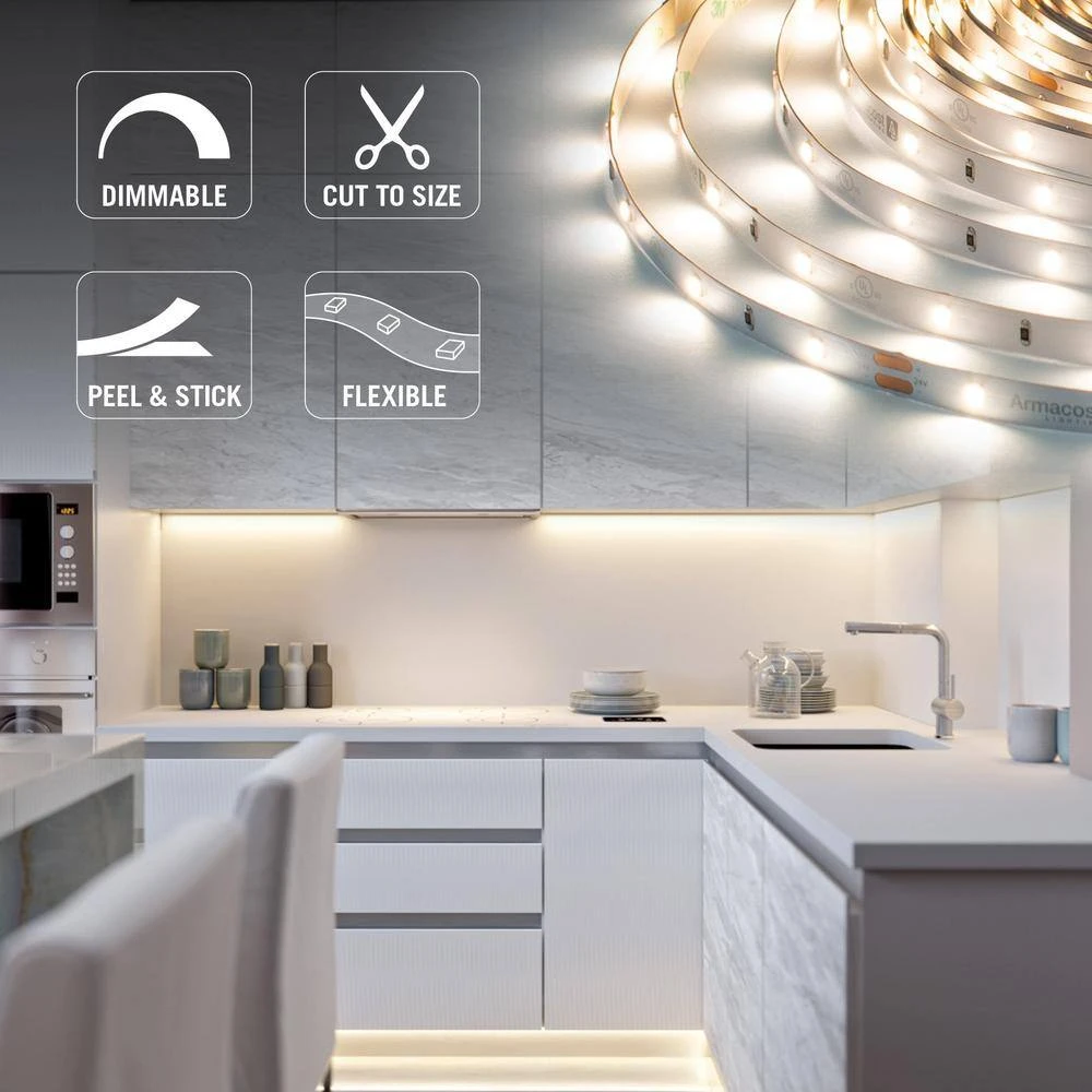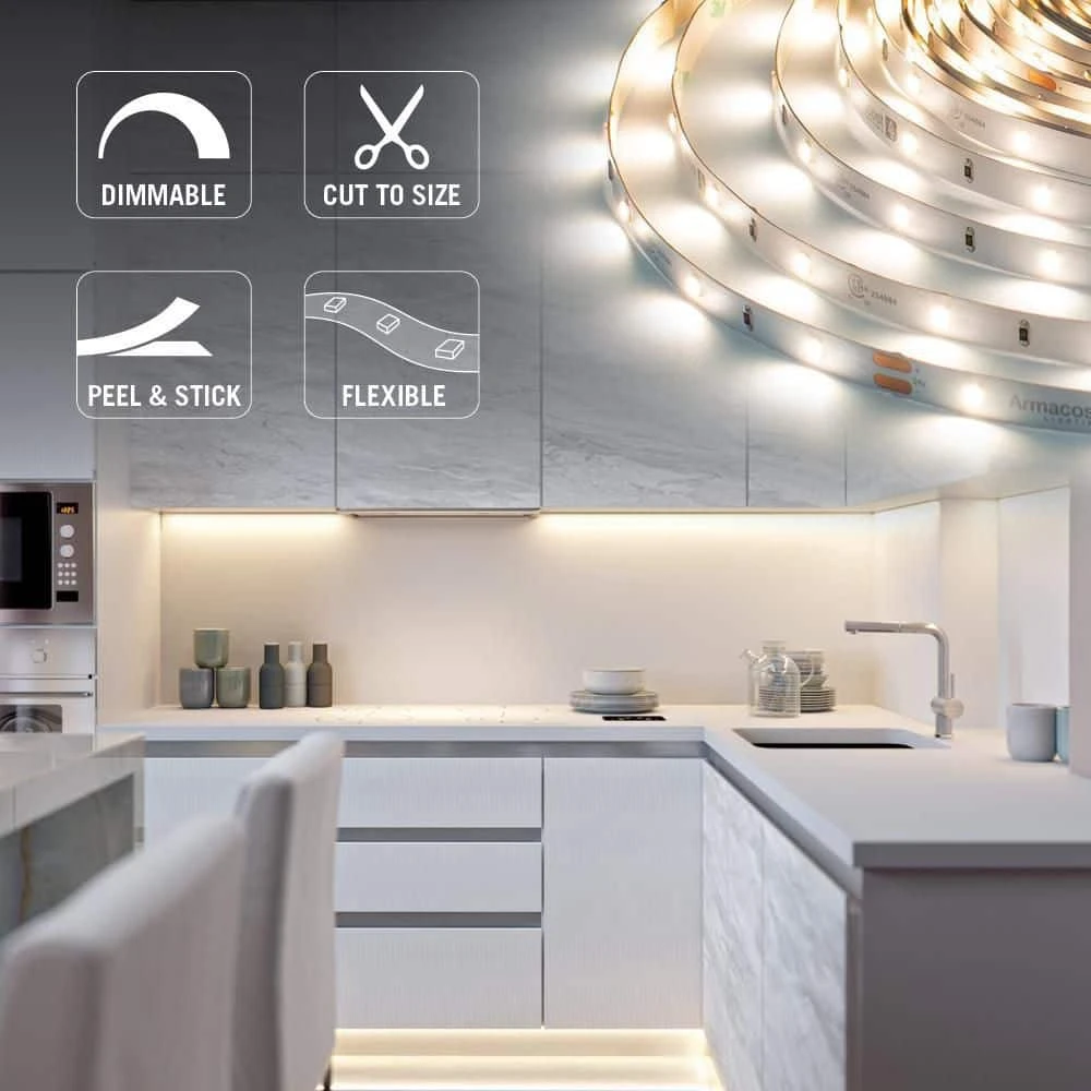 - Easy-to-install simply peel and stick the LED tape light or cut and reconnect for custom installations, 24-Volt strips are ideal for large projects that need extra-length; UL Safety Listed