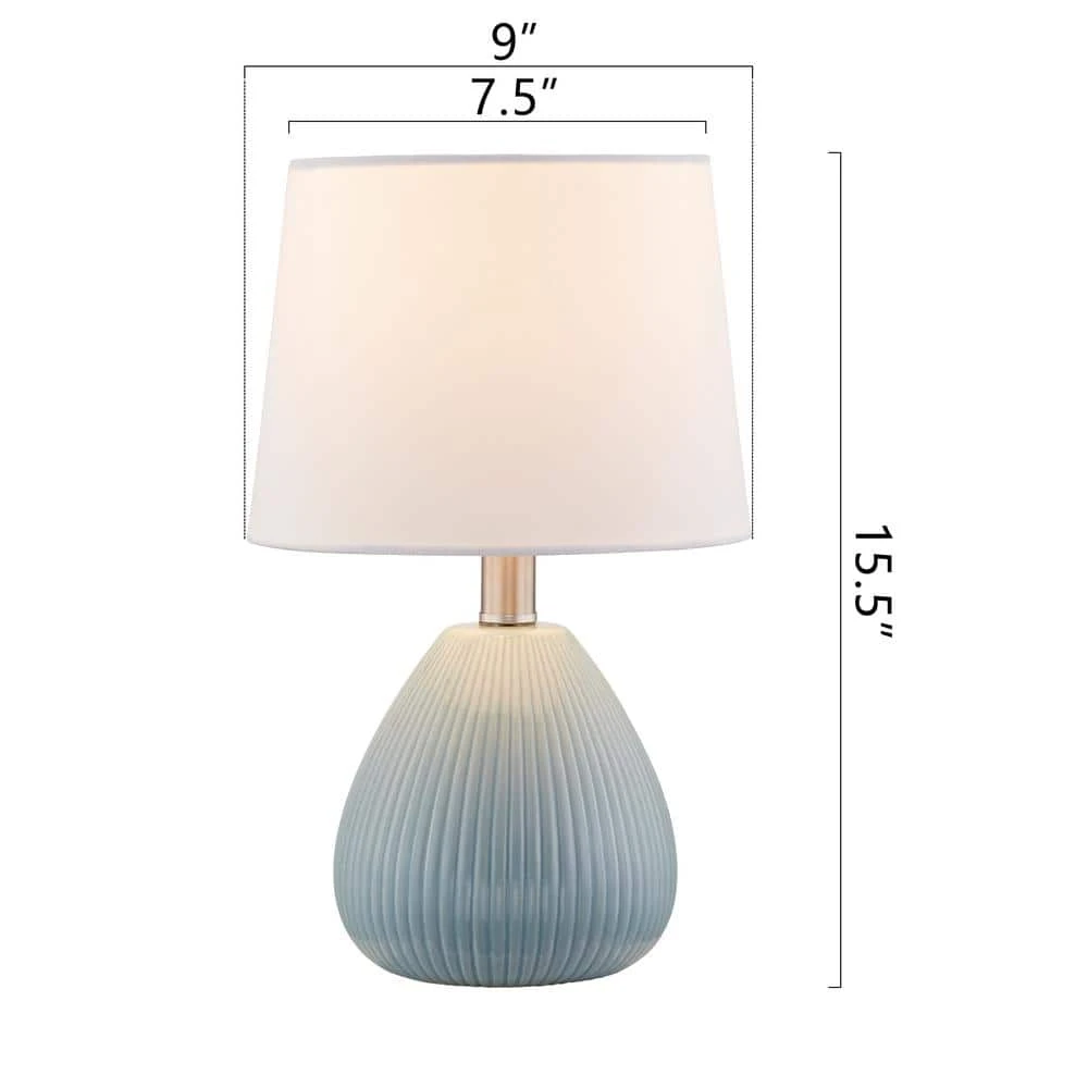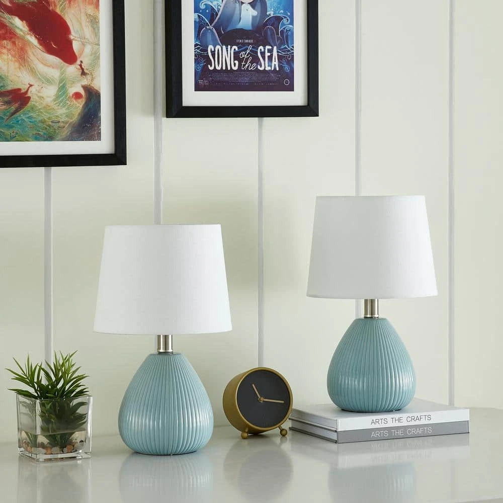 This contemporary ceramic table lamp in a 2-pack format combines elements of mid-century modern or bohemian style with a blue finish that is perfect for modern home decor. Each lamp has a teardrop-shaped base with distinctive ribbing and a slender metal neck with a rotary switch, paired with a cylindrical white linen shade that transmits light well for basic daily lighting needs.Maxax is a global brand with products that are ETL certified, creating superior lighting fixtures with safe and consistent quality.