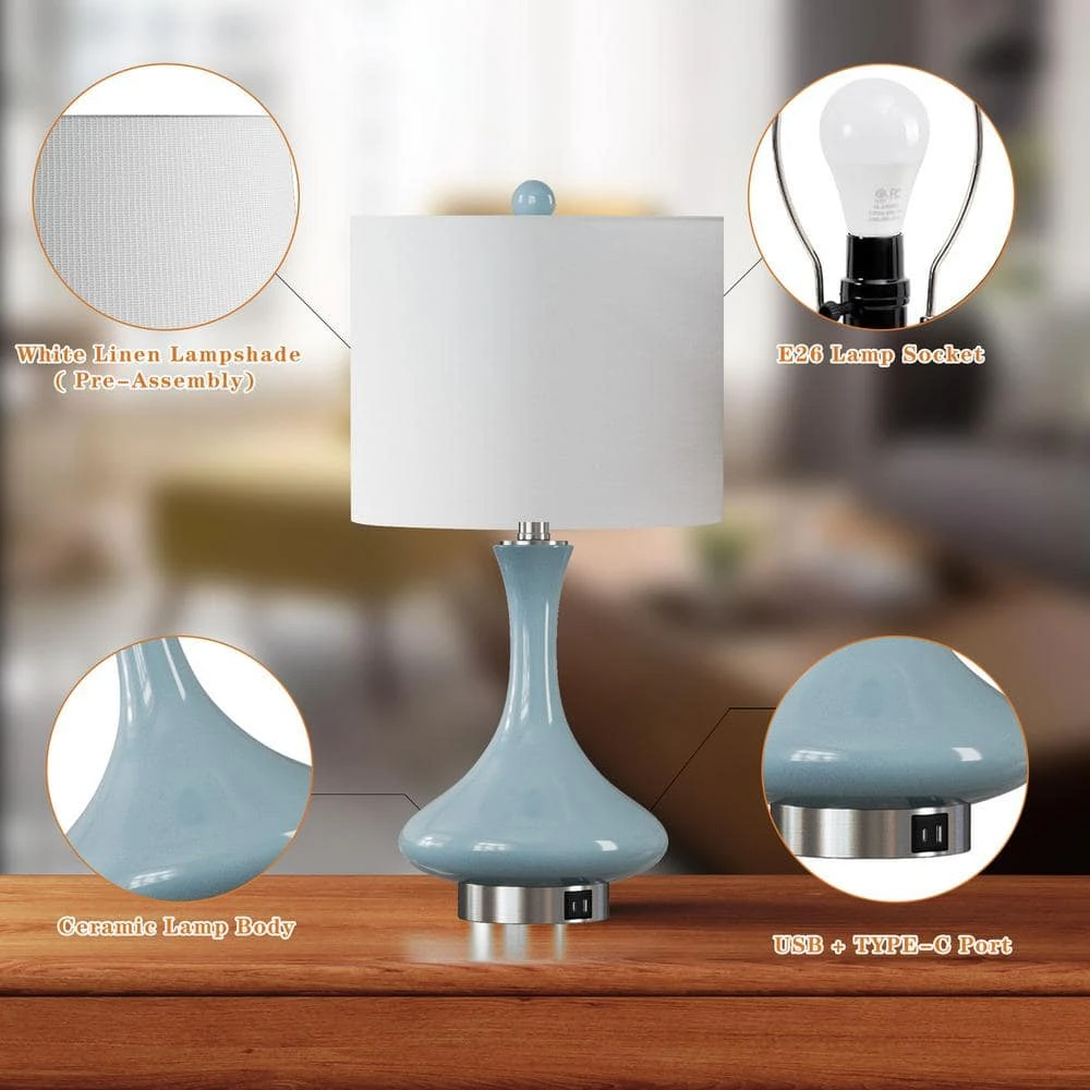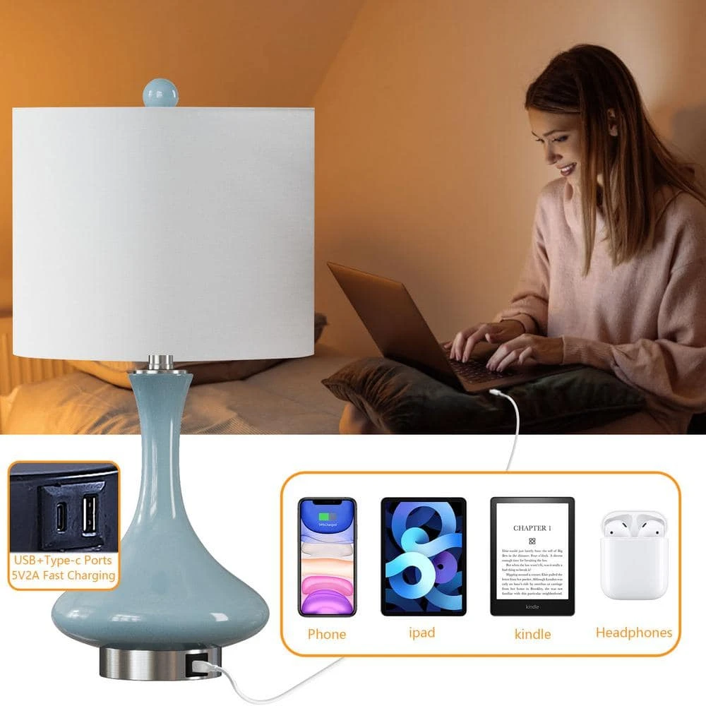 This modern table lamp combines a sleek blue ceramic body with a soft white lampshade and features a metal base for added stability. It is equipped with both USB and Type-C ports, allowing you to charge your phone, iPad, Bluetooth headphones, and other electronic devices. ETL-certified, it ensures safe use for peace of mind.