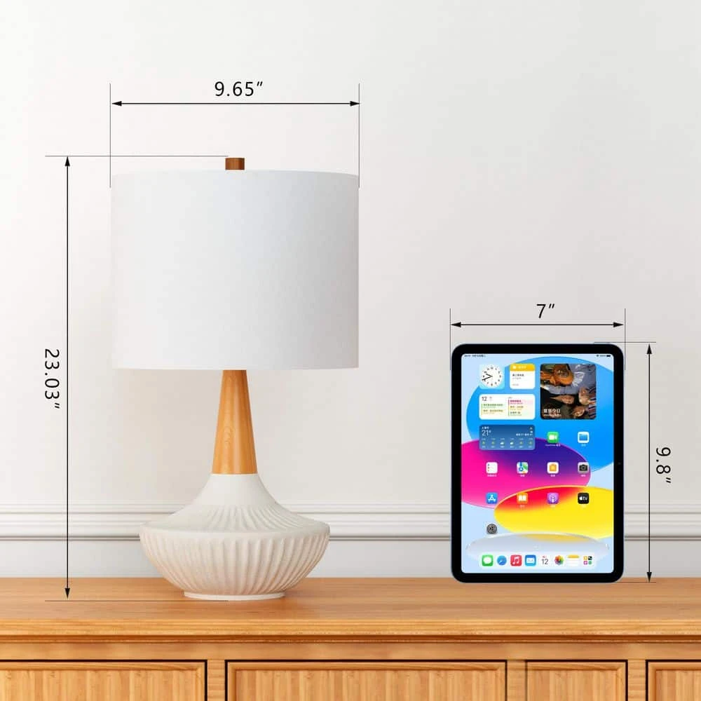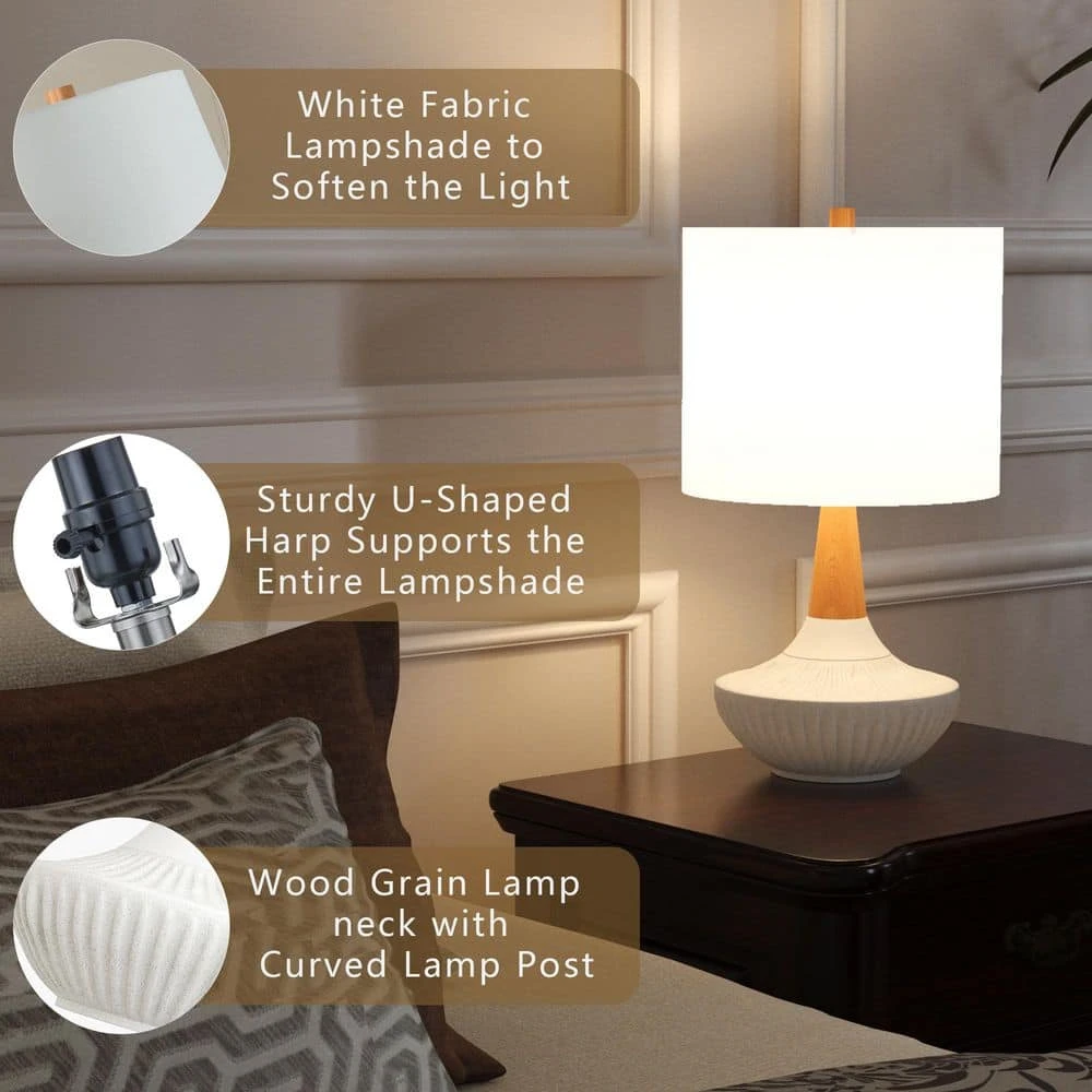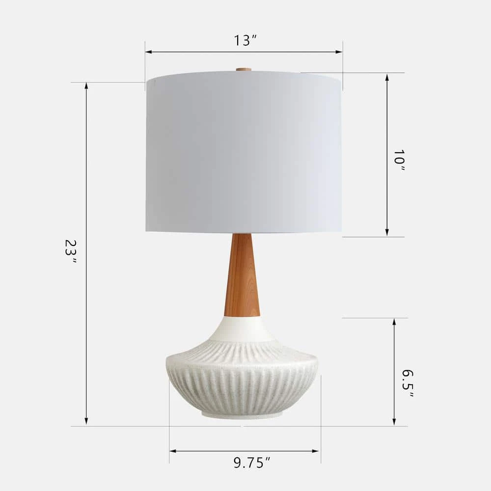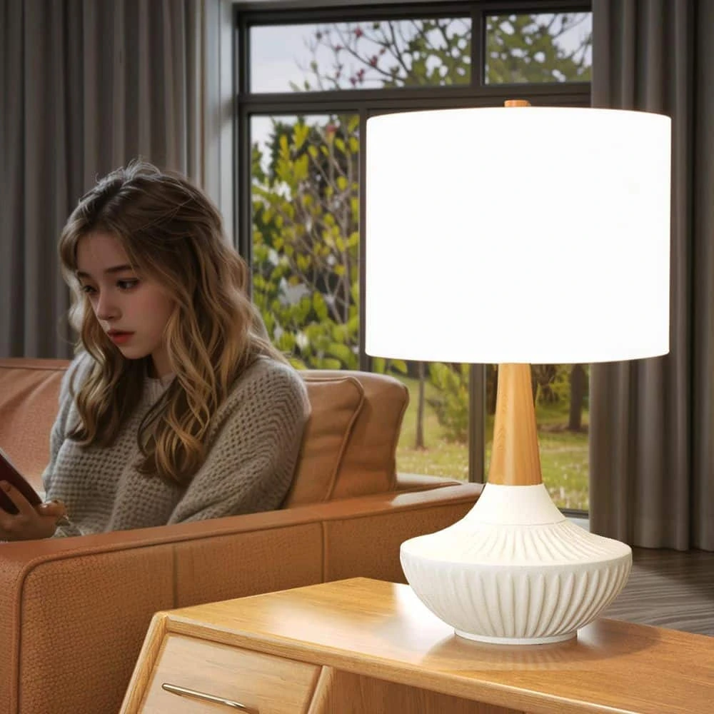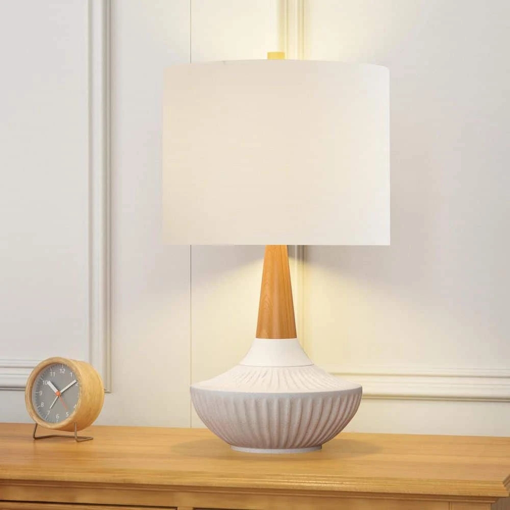 This lamp combines wood and light beige ceramic seamlessly, paired with a soft white linen lampshade to showcase a perfect blend of natural and modern aesthetics. It is ideal for bedside tables, living room corners, or study areas. Comes with a one-year manufacturer warranty and ETL certification for assured safety.