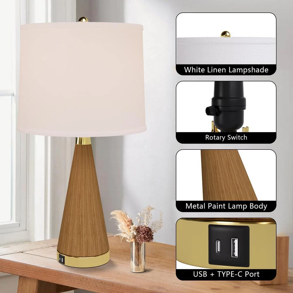This wood grain metal base table lamp features a sleek wood grain metal base with gold accents and a simple white fabric shade, providing soft lighting while enhancing the aesthetic of any room. It is equipped with USB and Type-C ports for charging your devices like smartphones, tablets, and Bluetooth headphones. The lamp is dimmable but requires a compatible dimmable bulb for use. ETL certified, ensuring product safety during use.