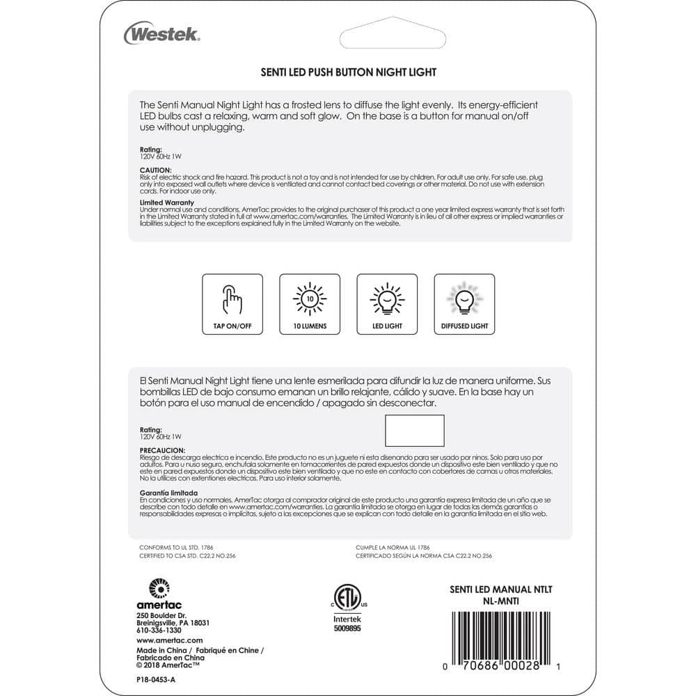 The Westek NL-MNTI Senti Push Button Light is the perfect night time lighting solution. This device turns on with a convenient summary and gives off 10 lumens of illumination; enough to see by without being obtrusive. Great for bedrooms, hallways, entryways, basements, bathrooms and more. Designed with a modern style that works with any decor. AmerTac manufacturing brands offer complete lines of distinctive decorative home accent products that include trend-setting wall plates, money saving LED night lights, innovative under cabinet lighting and LED battery operated lights. We also offer utility product lines including energy-saving timers, dimmers and lighting controls, as well as an extensive offering of consumer electronics accessories for the home and office.