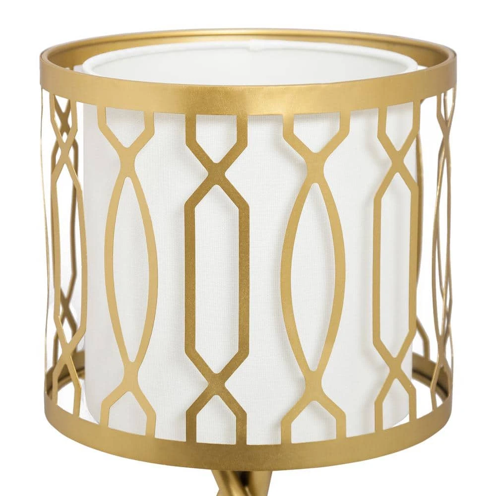 Double the decorative look in any room with this Set of 2 Lunita 17.5 in. Gold Tripod Base Table Lamps with White Fabric Drum Shades. This set of 2 table lamps features gold-t1 metal tripod bases that support white fabric drum-shaped shades wrapped in gold metal cages with cutout patterns. This peek-a-boo effect allows the Type A, 60-Watt E26 bulb (not included) in each lamp to create a soothing glow you can turn on and off easily with the in-line switch. UL Listed and LED compatible, these lamps will bring added style to your modern, glam or transitional decor.