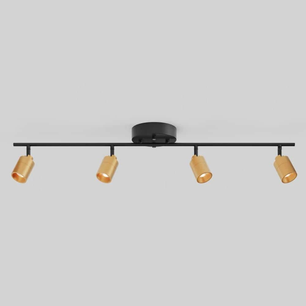 - Color & Features: This fixture has 4 spotlights attached to an aluminum track, finished in Matte Black and Brushed Brass. Each spotlight can be individually adjusted 270° horizontally and 90° vertically.
