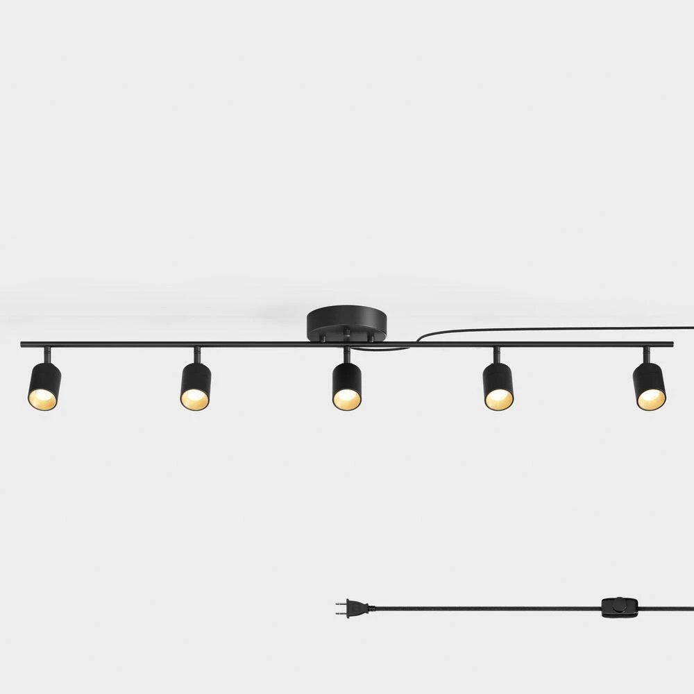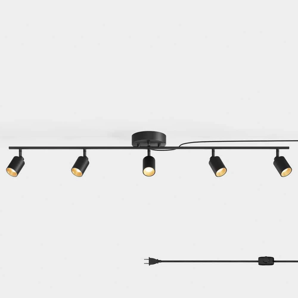 - Color & Features: This fixture has 5 spotlights attached to an aluminum track, finished in Matte Black. The durable woven cord includes a dimmer dial switch for easily accessible customized lighting.Each spotlight can be individually adjusted 270° horizontally and 90° vertically.