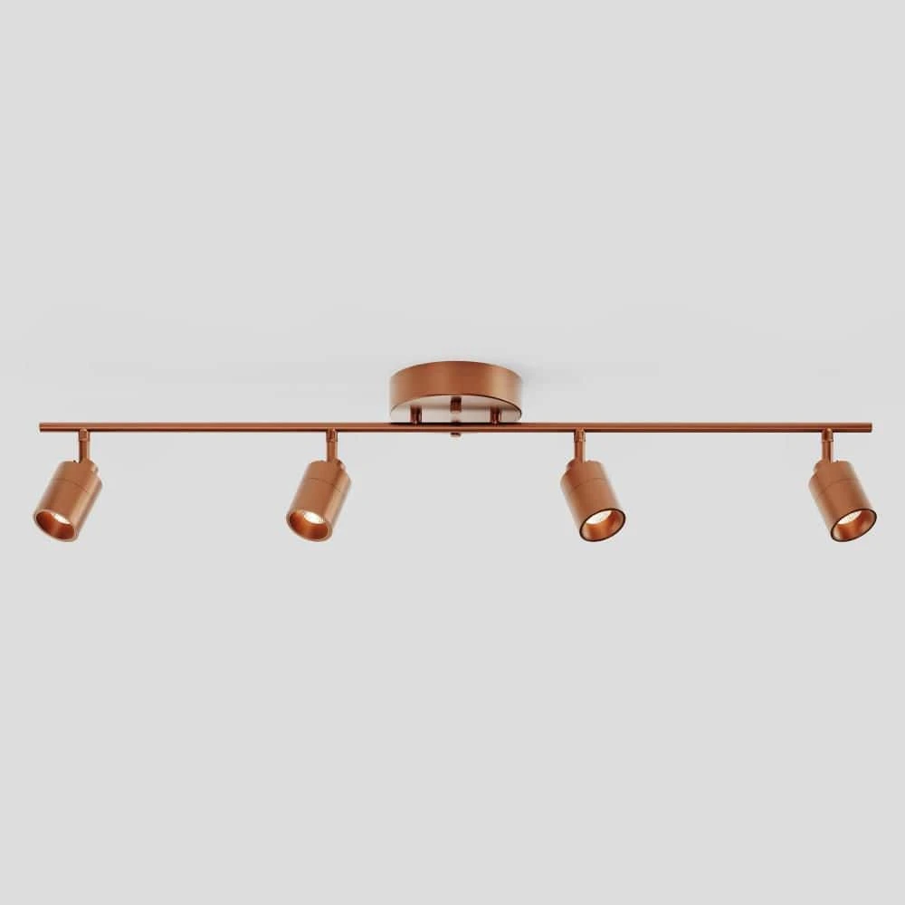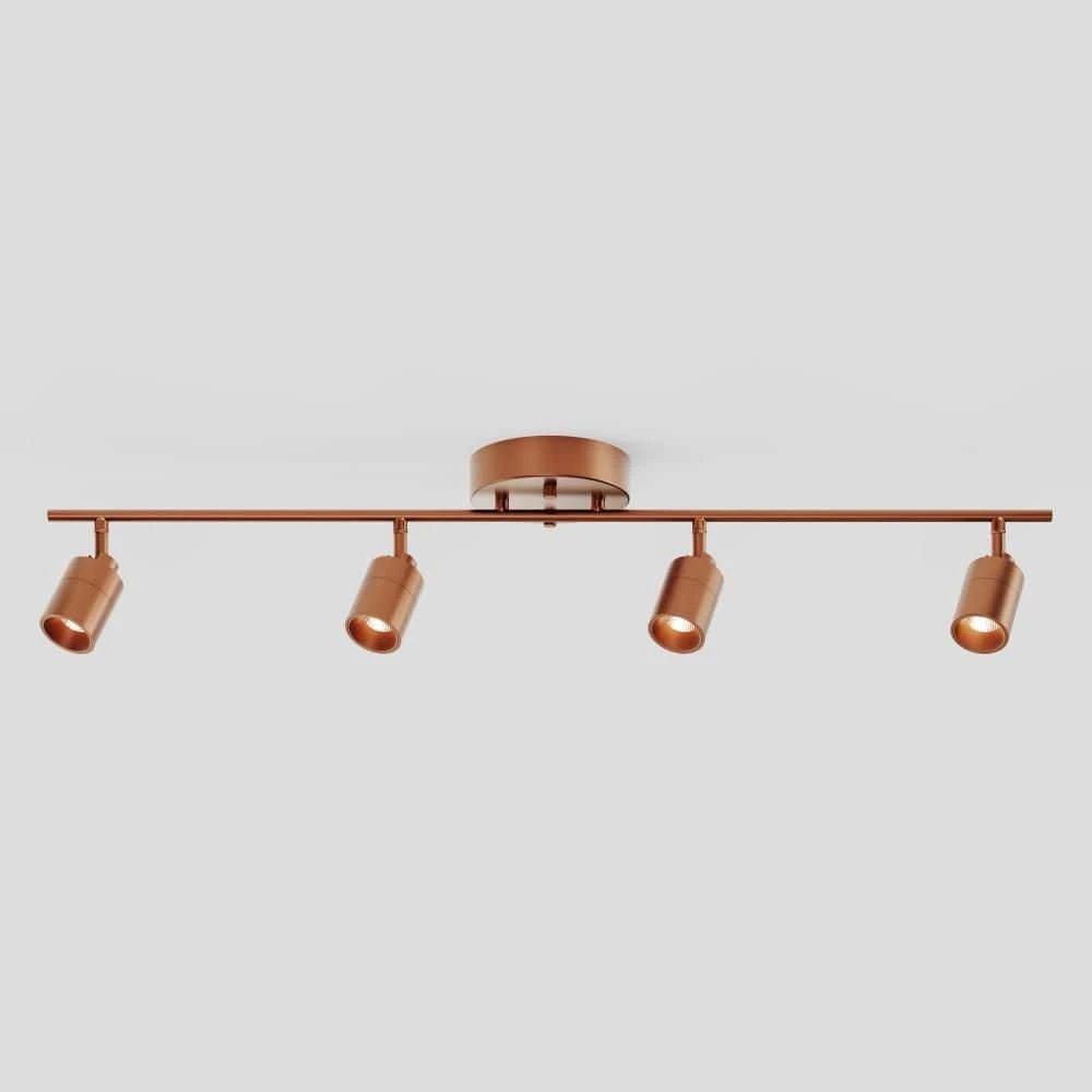 - Color & Features: This fixture has 4 spotlights attached to an aluminum track, finished in Brushed Copper. Each spotlight can be individually adjusted 270° horizontally and 90° vertically, with full range dimmability.