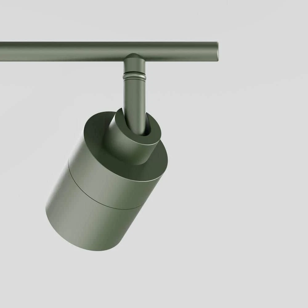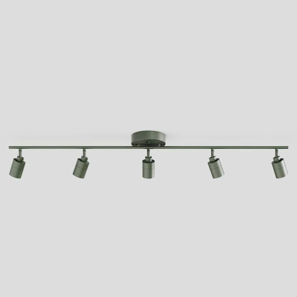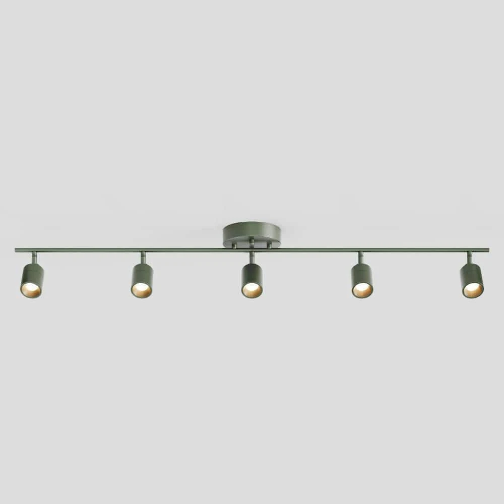 - Color & Features: This fixture has 5 spotlights attached to an aluminum track, finished in Matte Dark Olive. Each spotlight can be individually adjusted 270° horizontally and 90° vertically, with full range dimmability.