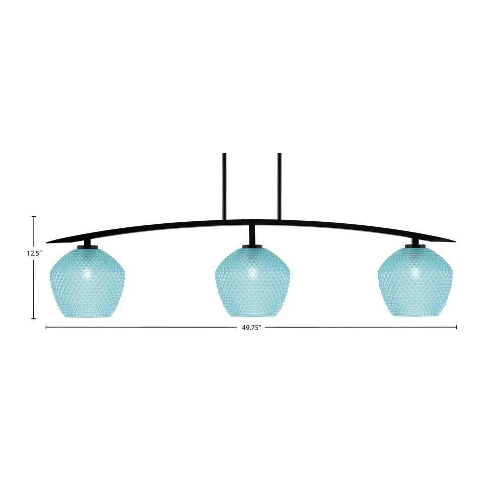 Illuminate your space with the Toltec Lighting Siena 3-light Bar, featuring a sleek Matte Black Finish and vibrant 9 in. Turquoise Textured Glass shades. This bar light seamlessly blends modern design with functional lighting, making it an ideal choice for contemporary settings, the Matte Black Finish complements the fixture’s clean lines, while the Turquoise Textured Glass shades add a pop of color and effectively diffuse light for a soft, ambient glow. Perfect for illuminating kitchen islands, dining areas or any space where style and illumination are desired, this fixture combines aesthetic appeal with practical functionality.