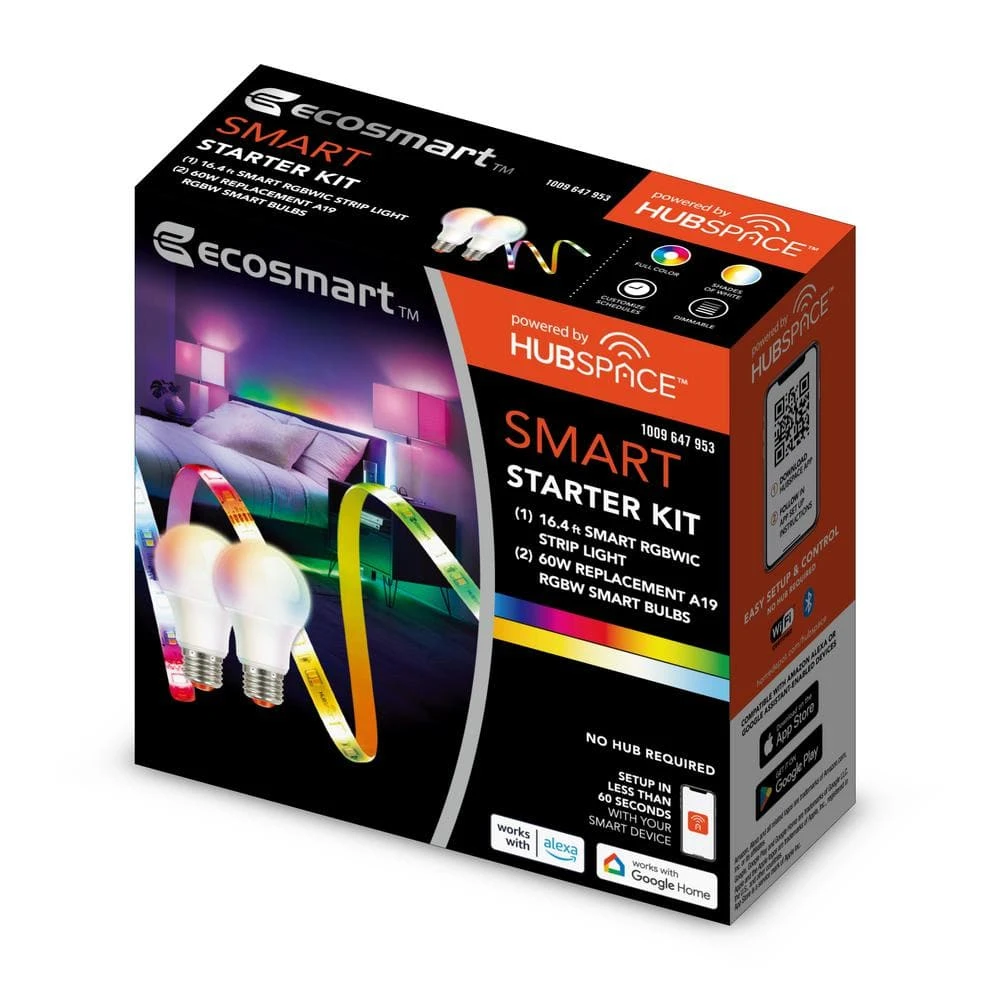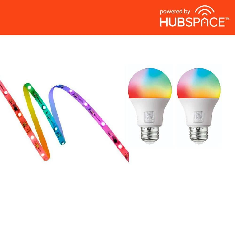 Upgrade your home with the easy to use smart home lighting kit. Included in the kit is a smart color changing 16ft. plug-in tape light and 2 color changing smart light bulbs. Powered by the Hubspace app, the smart tape light and smart light bulbs can be set up in 30 seconds or less.
