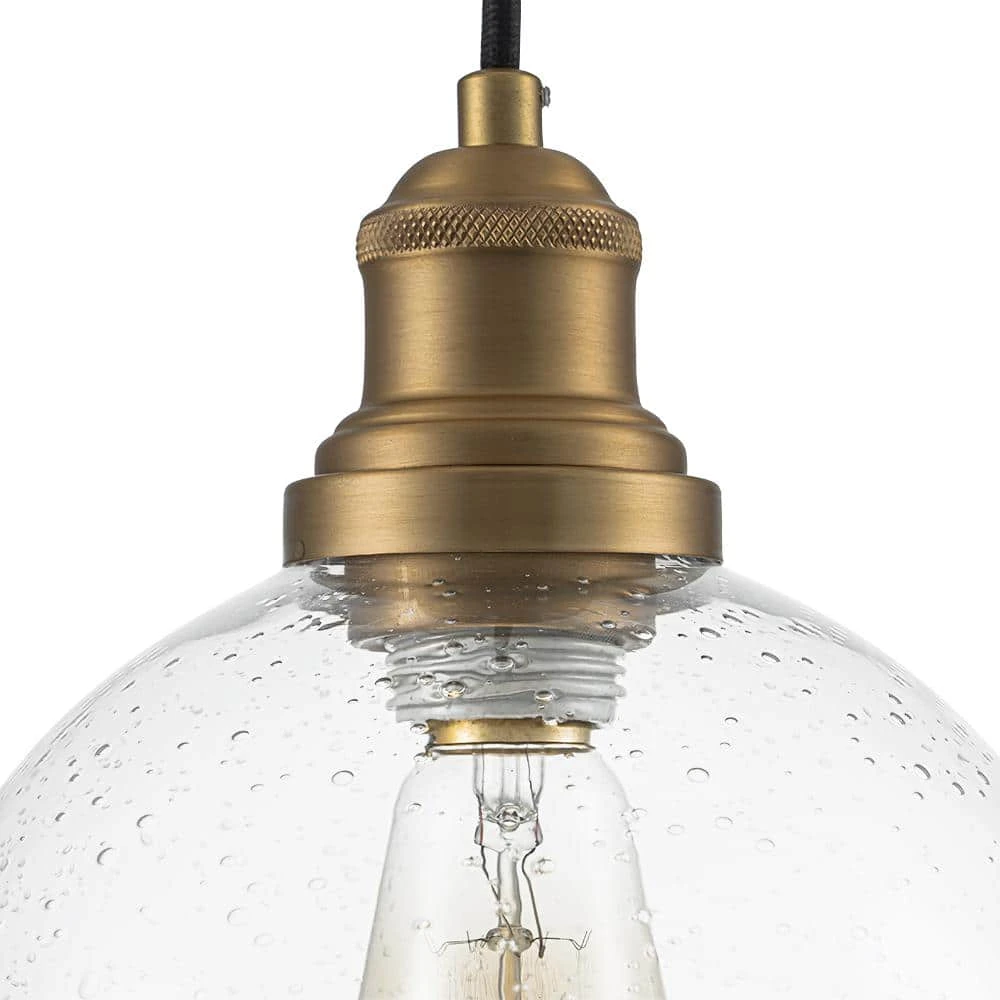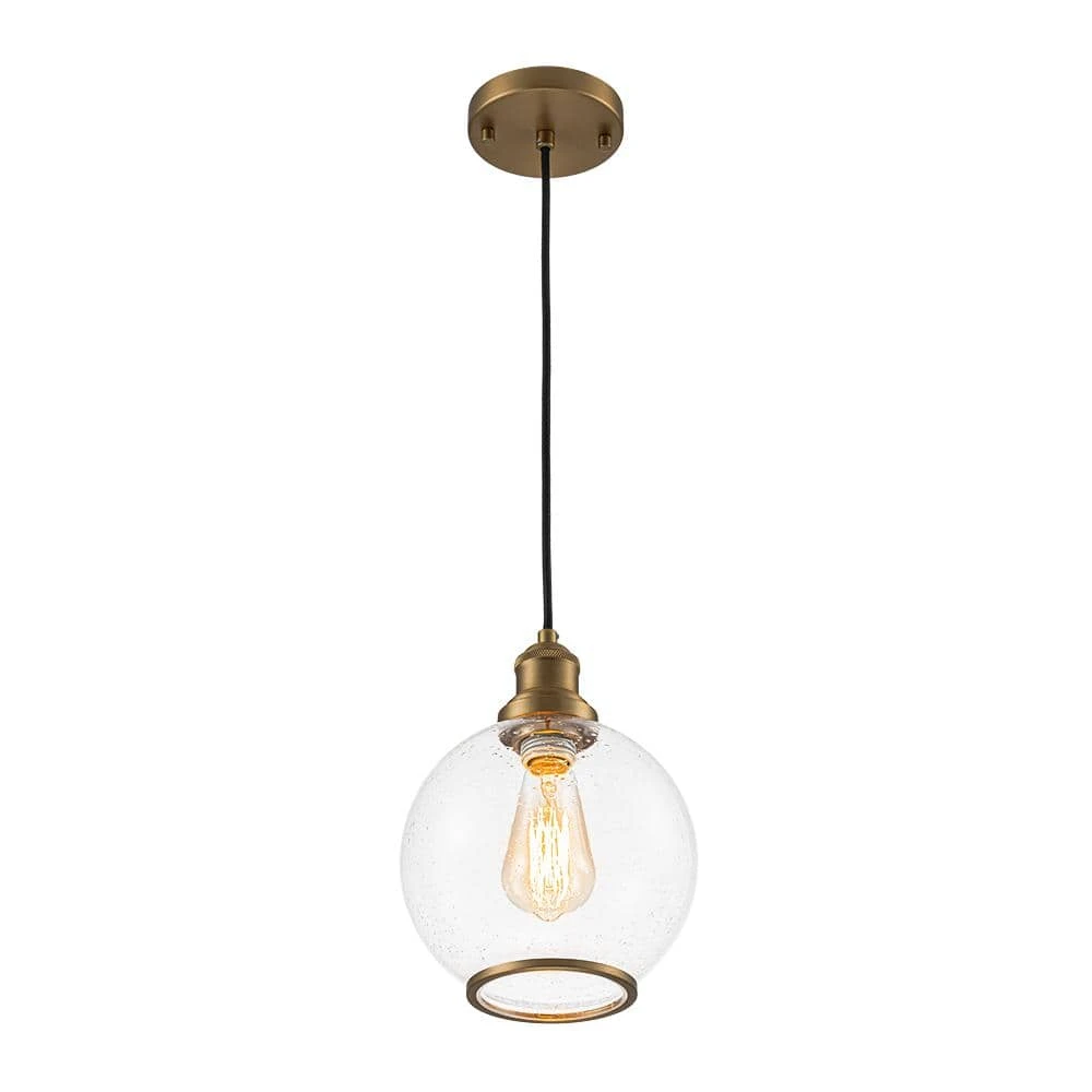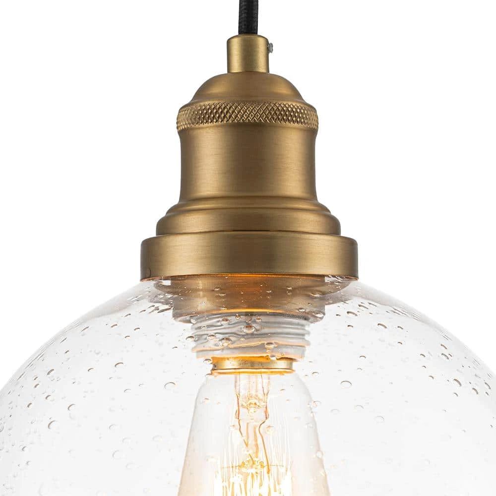 Introduce industrial sophistication into your space with this Seeded Glass Globe Pendant Light featuring a unique, cut-off globe shape. The seeded glass shade with a bubble texture diffuses light beautifully, offering a soft, ambient glow while the brass metal trim along the edges adds a refined touch. With its open bottom, this pendant light allows for a focused beam of light, perfect for highlighting specific areas like kitchen islands, dining tables, or entryways. The adjustable suspension cord makes it easy to position the light just where you need it, while its brass finish provides a stylish contrast to the glass. Ideal for adding both functional lighting and elegant design to your home, this piece works perfectly in modern, industrial, or transitional spaces.