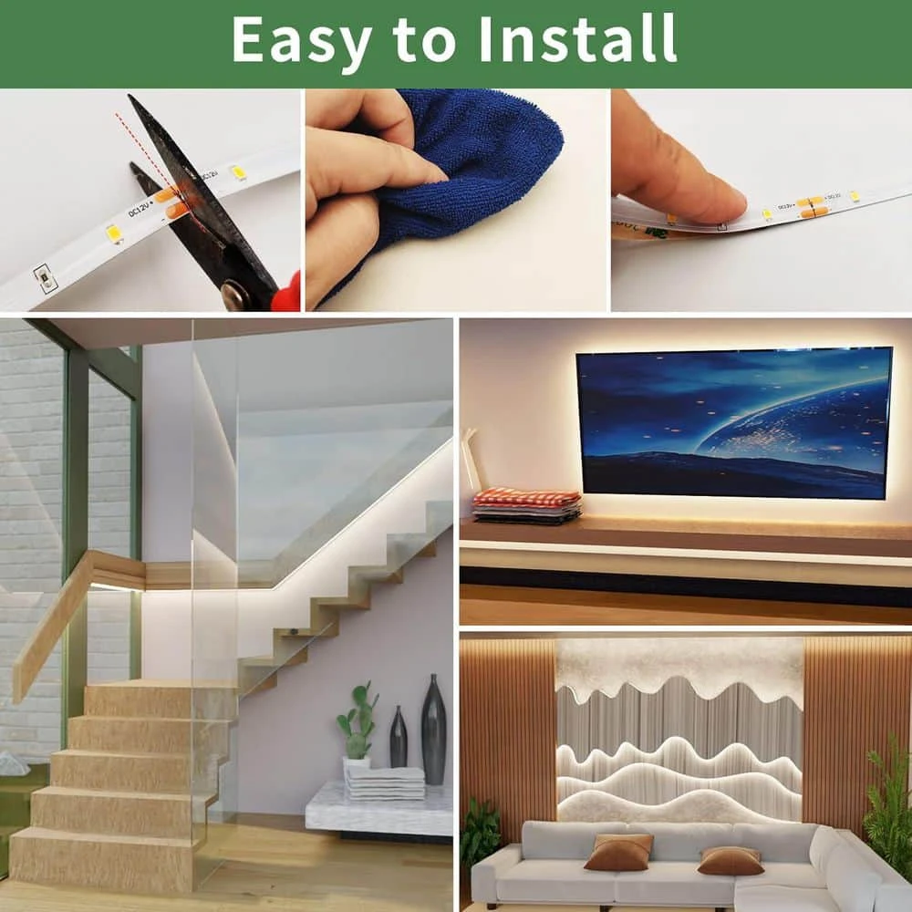 - Installing these LED strip lights is a breeze, the strong 3 m self-adhesive backing ensures the lights stay securely in place on any clean, dry surface, need to customize the length, simply cut along the marked lines on the copper sheet to adjust the strip without damaging the remaining leds