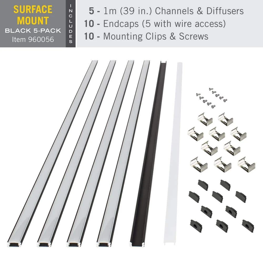 Surface Mount LED Tape Light Mounting Channels are made from high quality, double-anodized, aviation-grade aluminum alloy and are available in 3 profiles: straight, angled and recessed. They can be fitted with the included frosted polymer cover to conceal the LEDs and diffuse the light output. Channels are useful for installations where the lighting will be visible, such as on the underside of a shelf or in a display cabinet or to soften lighting to eliminate reflective hot spots on a nearby surface. They can be cut to length using a fine-tooth handsaw and run in sequence to create a longer fixture. They can be mounted to surfaces with the included brackets or double-sided adhesive tape (not included). Includes mounting hardware and end caps, the brackets guarantee easy and secure mounting to the desired surface and can also be used as connectors between channels.