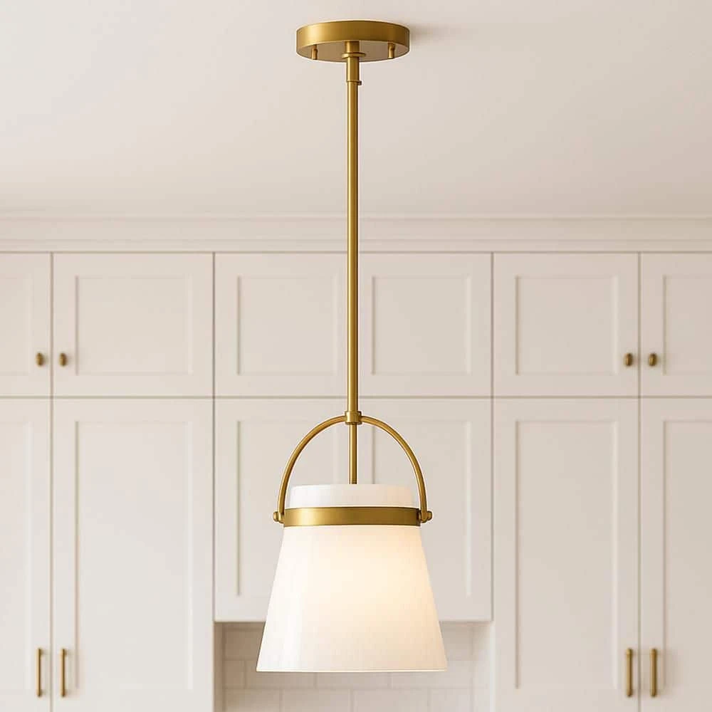 The Tori Single Light Pendant from Lark features a bell-shaped open shade that let light shine out of the topand bottom, filling the milky white Cased Opal Glass for a seamless overall glow. This Modern Farmhouse darling can be mounted in multiples over a kitchen island or dining table, in an entryway, home office, or bedroom. Available in a sophisticated Lacquered Brass or Black finish with additional down rods to customize how far down the fixture hangs on even or sloped ceilings (up to 90°).