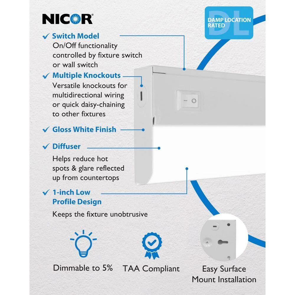Introducing NICOR’s all-new UCB Series LED Under Cabinet Light with selectable color temperature, available in a sleek and compact design. The UCB is offered in 7 different sizes, ranging from 9 in. to 42 in. in length, offering versatile options to suit your needs. Each undercabinet fixture includes 5 Selectable Color Temperature outputs, ranging from warm white to daylight white. With advanced LED technology, the UCB achieves an impressive CRI rating of over 90 and an R9 over 50, ensuring exceptional light quality with vivid reds, accurate blues and everything in-between. The sleek 1 in. profile design ensures the UCB remains discreetly hidden beneath cabinets, seamlessly enhancing ambient light in your kitchen. The specially designed diffuser lens helps to reduce hot spots and glare reflected up from countertops. Elevate your space with the brilliance of NICOR’s UCB undercabinet lighting solution, backed by a 5-year limited warranty for your peace of mind.