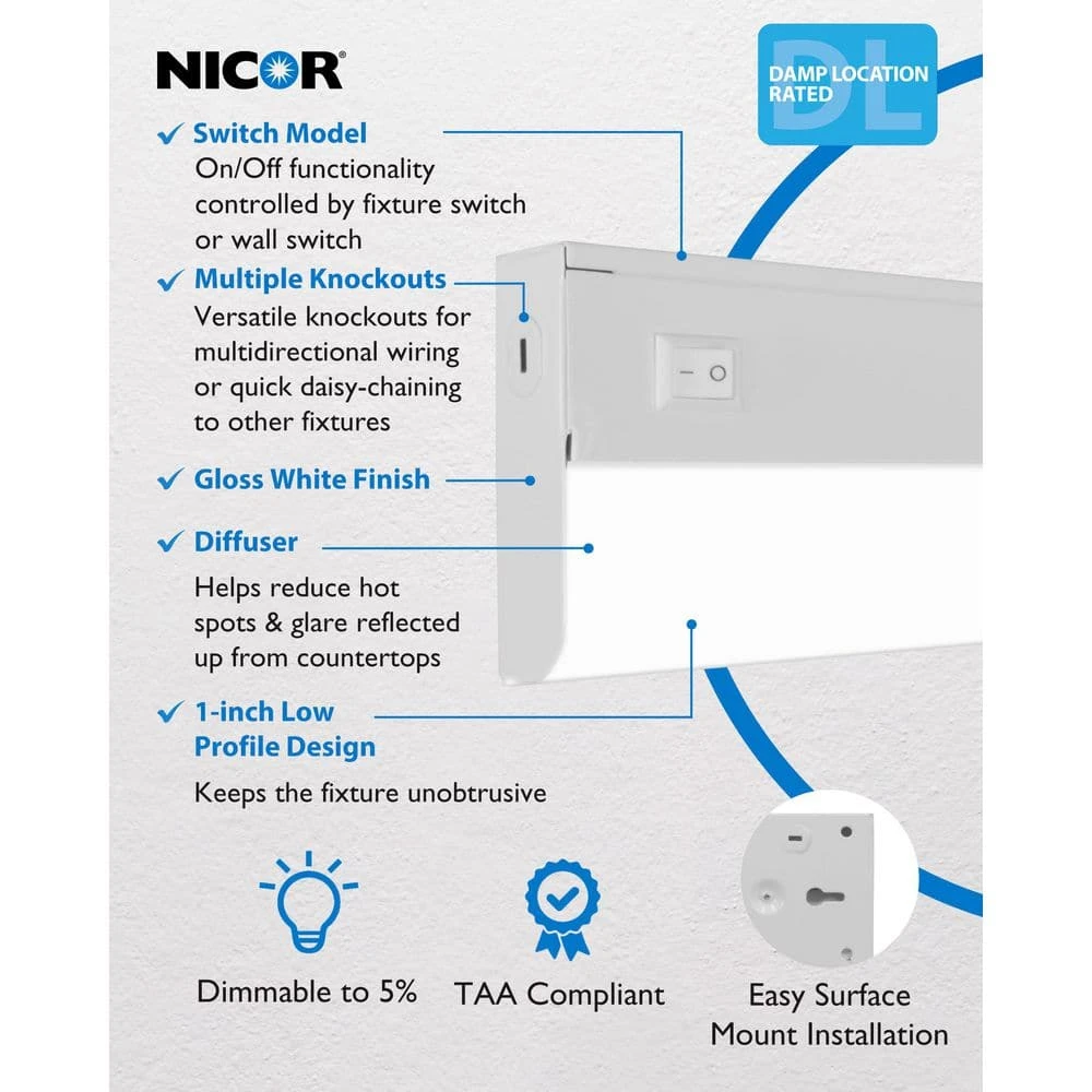 Introducing NICOR’s all-new UCB Series LED Under Cabinet Light with selectable color temperature, available in a sleek and compact design. The UCB is offered in 7 different sizes, ranging from 9 in. to 42 in. L, offering versatile options to suit your needs. Each undercabinet fixture includes 5 Selectable Color Temperature outputs, ranging from warm white to daylight white. with advanced LED technology, the UCB achieves an impressive CRI rating of over 90 and an R9 over 50, ensuring exceptional light quality with vivid reds, accurate blues and everything in-between. The sleek 1 in. profile design ensures the UCB remains discreetly hidden beneath cabinets, seamlessly enhancing ambient light in your kitchen. The specially designed diffuser lens helps to reduce hot spots and glare reflected up from countertops. Elevate your space with the brilliance of NICOR’s UCB undercabinet lighting solution, backed by a 5-year limited warranty for your peace of mind.