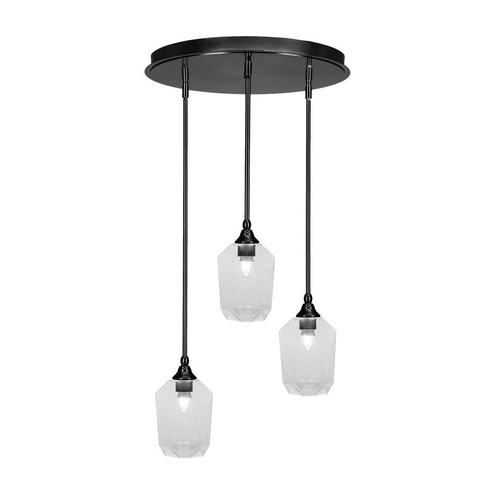 Introducing the Villa 3 Light Matte Black Pendant, a sleek and stylish lighting fixture for your home. This Cluster Pendant Light features 6.25 in. Clear Bubble Glass Shades that provide a contemporary touch to any space. Please note that bulbs are not included with this pendant, allowing you to customize the lighting to suit your preferences.