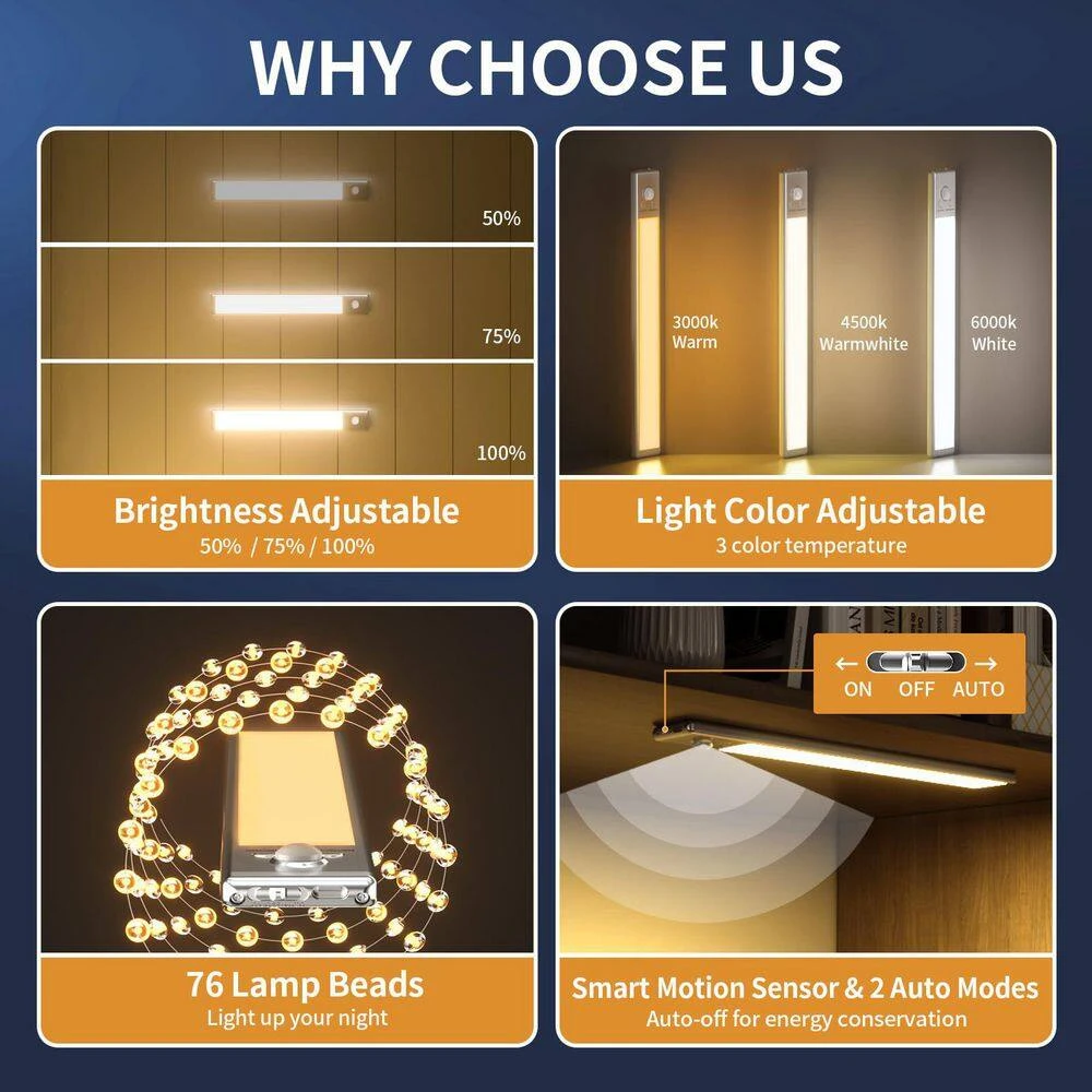 - Smart Motion Sensor: The under cabinet lights automatically turn on when human motion is detected within 120° and 10 feet in a dark or low – light environment. They turn off after about 18 seconds of no motion, preventing trips in the dark.