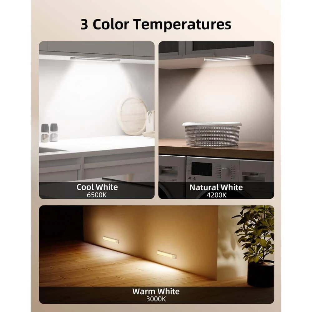 - 3 color temperatures available – warm light (3000K), natural light (4200K), and cool white (6500K) – to meet different lighting needs. Also offers 3 brightness levels for various scenarios, like brightening for meal – prep or dimming at night.