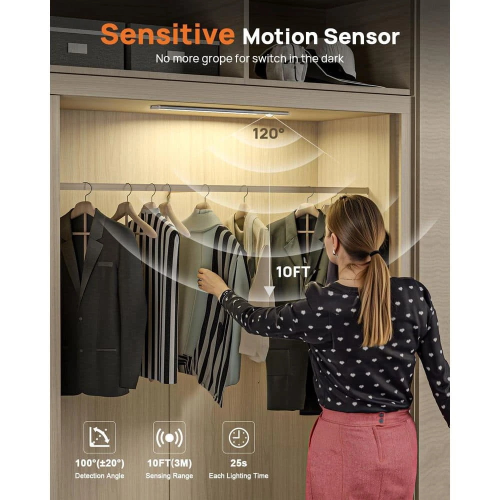 Upgrade your indoor lighting with this 16 – inch under – cabinet lighting set. Each light is equipped with 160 high – brightness LEDs, reaching a maximum of 500 lumens. The brightness is adjustable from 10% to 100% in 6 levels via a wireless remote control within 16ft. It has a smart motion sensor that activates within 10 ft / 120° range and offers 3 auto – working modes. The light also features 3 color temperature dimmable options from 2700K – 6000K and 4 time settings. Installation is a breeze with built – in magnets or adhesive metal plates. Suitable for kitchens, closets, workshops, and more, it brings comfort and convenience to your daily life.
