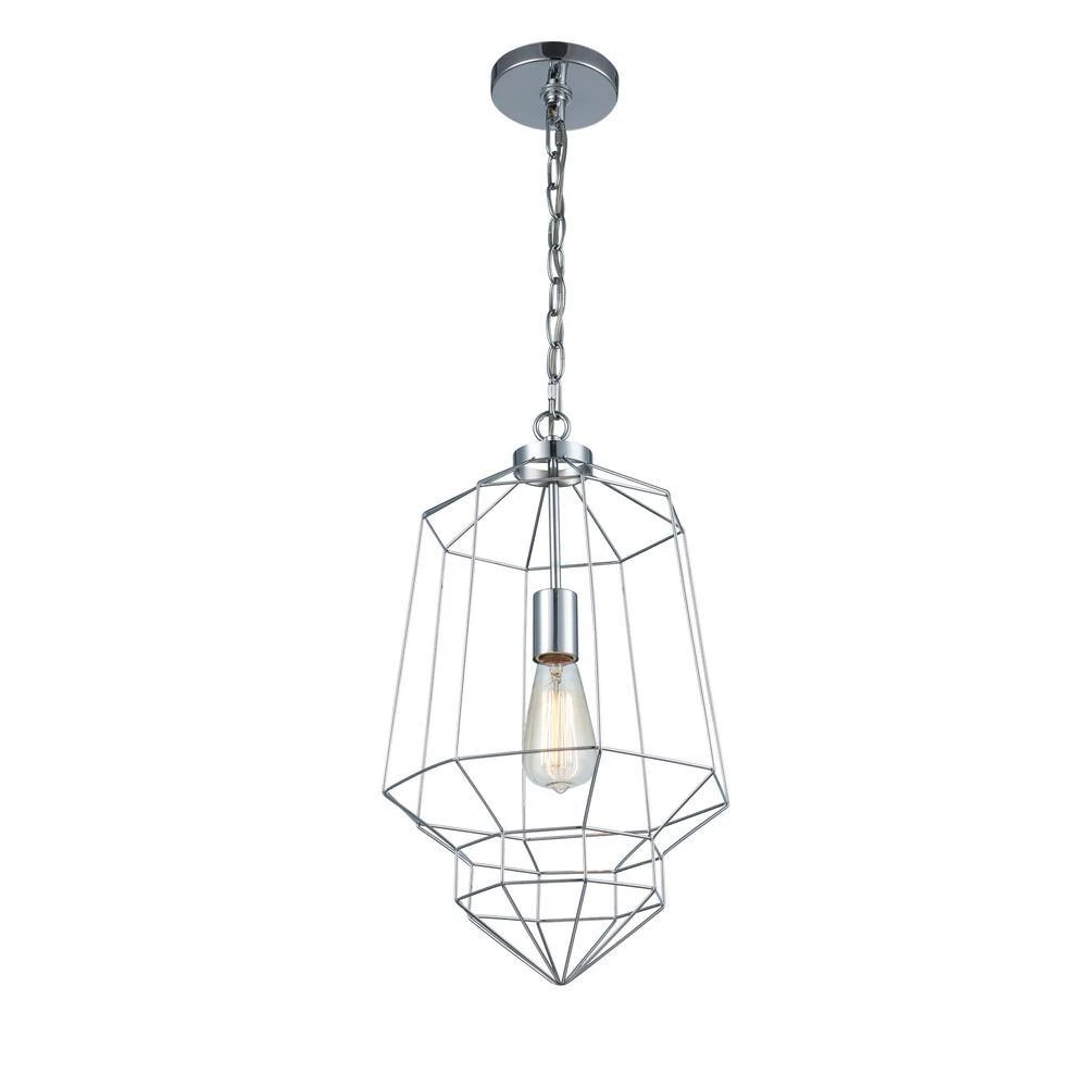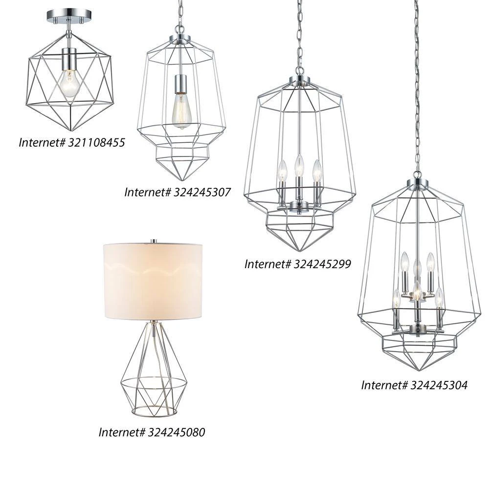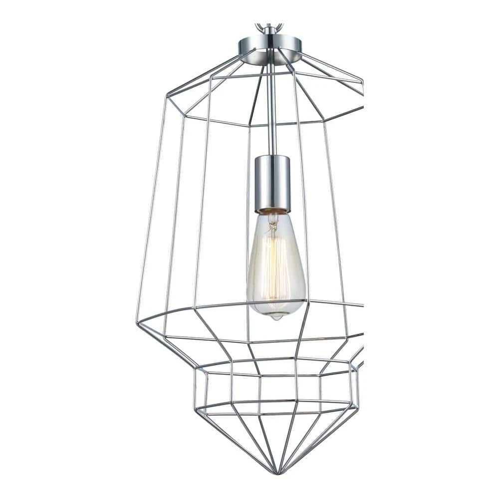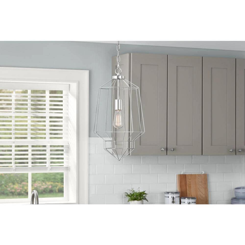 The Winfield Collection from Hampton Bay features midcentury modern ceiling lighting designed to suit a variety of interior decor styles, from transitional to contemporary. The Winfield pendant is a decorative fixture that works well in dining areas, kitchens and foyer entrances. Use as a single unit over a dining room table or install as a set over a linear kitchen island or bar table for additional illumination in larger spaces. The frame is constructed of chrome finished metal and includes a round ceiling plate and a geometric-caged metal shade. The cage features an open triangular weave that comes together in a globe shape, houses a single light bulb inside, and allows for easy access to change the bulb through the open spaces. The pendant body hangs from a matching chain, offering height adjustability and sloped ceiling compatibility. Shop the Winfield Collection for coordinating fixture for your entire home.